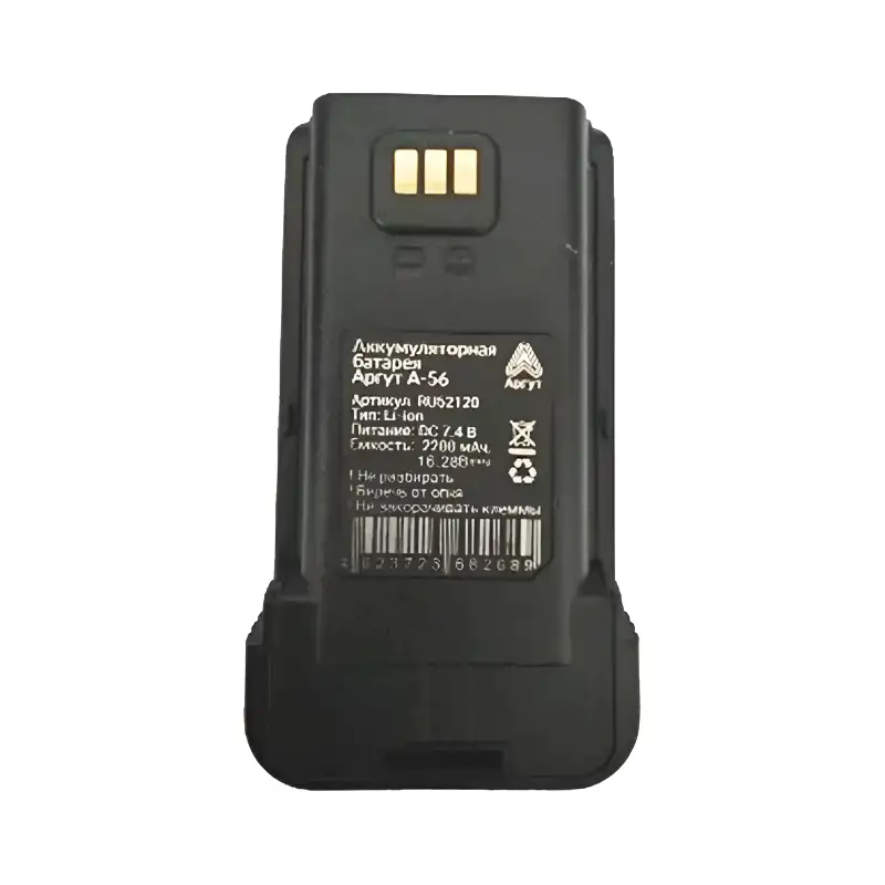 Аккумулятор Аргут BAT-56 — оригинальный литий-ионный элемент питания емкостью 2200 мА·ч, созданный для радиостанции Аргут А-56. Он обеспечивает длительную и стабильную работу устройства и обладает высокой устойчивостью к температурным колебаниям в диапазоне от –20 до +50 °C, что позволяет использовать радиостанцию в разных климатических условиях.