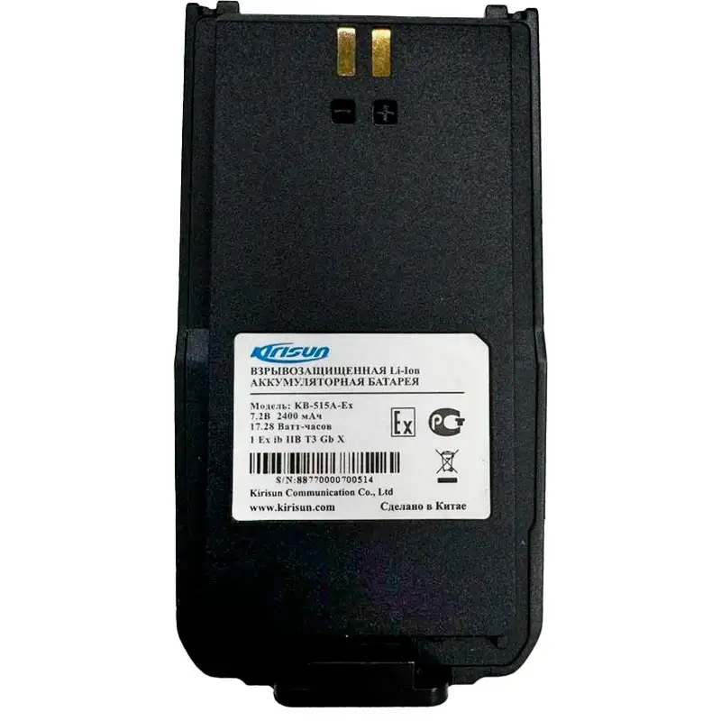 Kirisun KB-515A-Ex — это специализированный взрывобезопасный литий-ионный аккумулятор, предназначенный для портативной радиостанции Kirisun DP-515-Ex. Аккумулятор имеет ёмкость 2400 мАч и выходное напряжение 7,4 В, что обеспечивает длительное время работы радиостанции в полевых условиях. Благодаря взрывозащищённой конструкции он соответствует требованиям безопасности для работы в опасных и взрывоопасных зонах. Максимальный ток нагрузки составляет около 1,77 А, что позволяет поддерживать стабильную работу устройства при высокой нагрузке. Аккумулятор отличается надёжностью, долговечностью и совместимостью с моделью DP-515-Ex, что делает его оптимальным выбором для профессионального использования в сложных условиях.