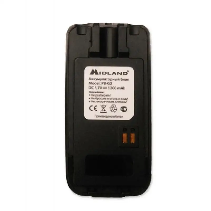 Midland PB-G2 — литий-ионный аккумулятор с емкостью 1800 мАч и напряжением 3,7 В, специально разработанный для портативных радиостанций Midland G2. Он отличается увеличенной емкостью, что обеспечивает продолжительное время работы без подзарядки, а также высокой стабильностью питания и надежностью в различных условиях эксплуатации. Аккумулятор поддерживает зарядку как в составе радиостанции, так и отдельно, что повышает удобство использования. Работает в широком температурном диапазоне от -20°C до +40°C, что позволяет применять его в разнообразных климатических условиях и работать долго и эффективно.