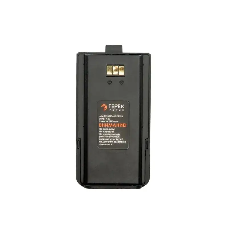 Влагозащищённый литий-полимерный аккумулятор Терек РК-322 DMR PRO с ёмкостью 2970 мА⋅ч и номинальным напряжением 7.4 В для портативных радиостанций. Устройство обеспечивает стабильную работу радиостанции, сохраняя высокую производительность в диапазоне температур от −50 до +70 °C, включая сильные морозы.