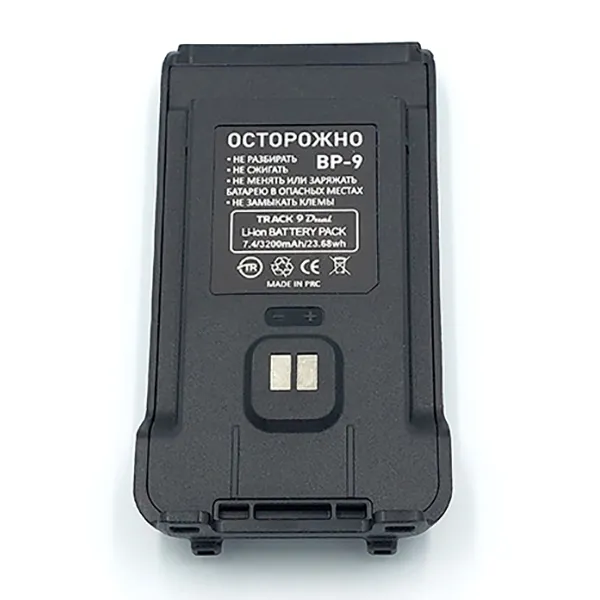 Батарея BP-9Li разработана специально для Track 9. Она поставляет надежные 3200 мАч при 7.4В, обеспечивая бесперебойный прием, передачу и мониторинг каналов даже при интенсивных нагрузках, в экстремальной жаре, морозе, под дождем или сильной вибрацией. Технология Li-Ion полностью избавлена от эффекта памяти, что разрешает заряжать устройство в любой момент без снижения характеристик; интегрированная схема блокирует перегрев, чрезмерный разряд и замыкания, продлевая жизнь батареи за 700 циклов. Усиленный корпус из прочного полимера соответствует IP67, сопротивляется падениям, грязи и влаге; малый вес и эргономичные размеры позволяют удобно носить на ремне, в кармане униформы или кобуре, не мешая подвижности в ходе задач.