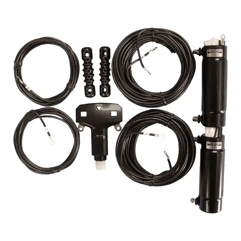 Diamond W735 — это траповый диполь, использующий изолированные кабели в качестве антенного полотна, где каждого плеча составляют резонансные ловушки. Для равномерного тока применяется балун, объединяющий обе части. Такая конструкция позволяет работать на двух диапазонах — 3.5 и 7 МГц.