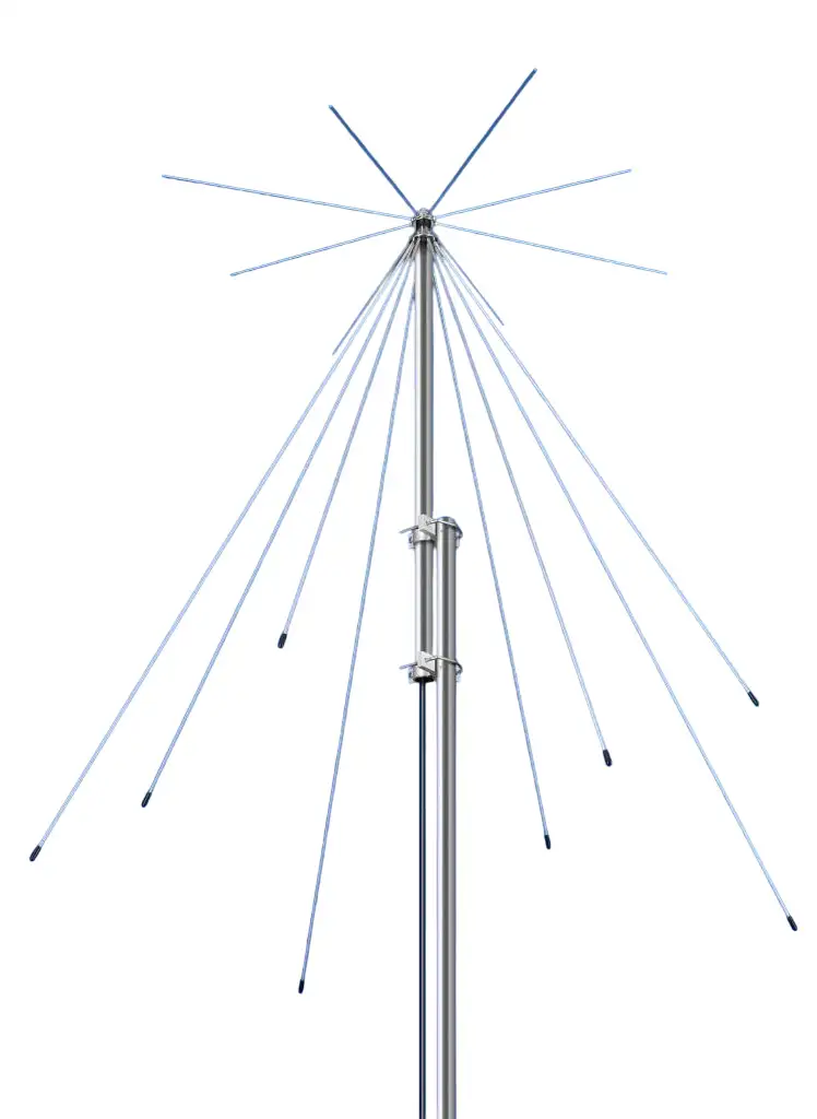 Дискоконусная антенна Icom AH-8000 охватывает приём от 100 МГц до 3.3 ГГц без настройки, обеспечивая равномерную круговую диаграмму направленности с усилением до 3 dBi и КСВ менее 1.5:1 по всей полосе. Конструкция высотой 936 мм и массой 970 г с разъёмом N-type выдерживает ветер до 50 м/с, температуру -50..+60°C и прямое заземление для грозозащиты, передавая до 200 Вт на диапазонах 118–137/144–148/222–225/430–450 МГц. Крепление на мачту 25–50 мм и коаксиал 15 м упрощают установку для мониторинга или базовых станций в профессиональных сетях.