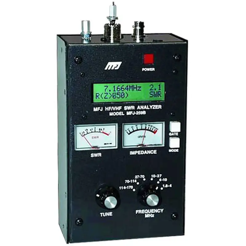 MFJ-259B - Небольшой и надежный антенный анализатор с автономным питанием.В его составе присутствуют частотометр, широкодиапазонный генератор, 50-омный высокочастотный измерительный мост и калиброванный измерительный мост разбалансированности. Рабочий диапазон 1.8-170МГц.