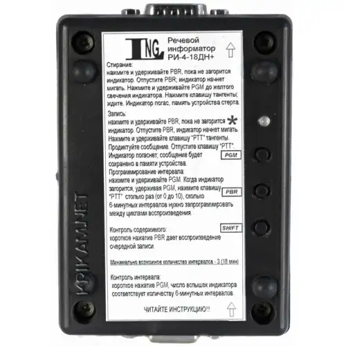 Автоинформатор РИ-4-18ДН, который оснащён тумблером-переключателем.Установка автоинформатора не требует особых навыков, достаточно включить его между тангентой и радиостанцией.