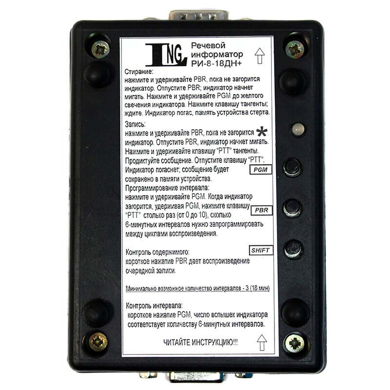 Автоинформатор РИ-8-18ДН, который оснащён тумблером-переключателем.Установка автоинформатора не требует особых навыков, достаточно включить его между тангентой и радиостанцией.