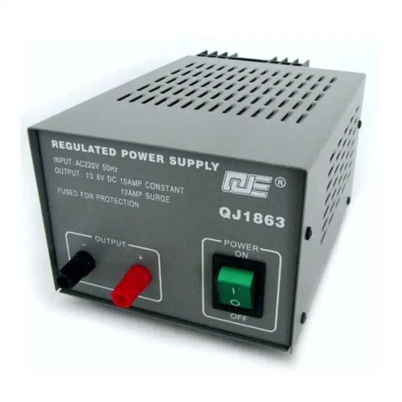 Блок питания Qje QJ1863 представляет собой трансформаторный стабилизированный источник питания с выходным напряжением 13.8 В и номинальным током 10 А, максимальным до 12 А. Используется для надежного питания радиостанций Си-Би и УКВ, усилителей, а также другого радиотехнического оборудования.