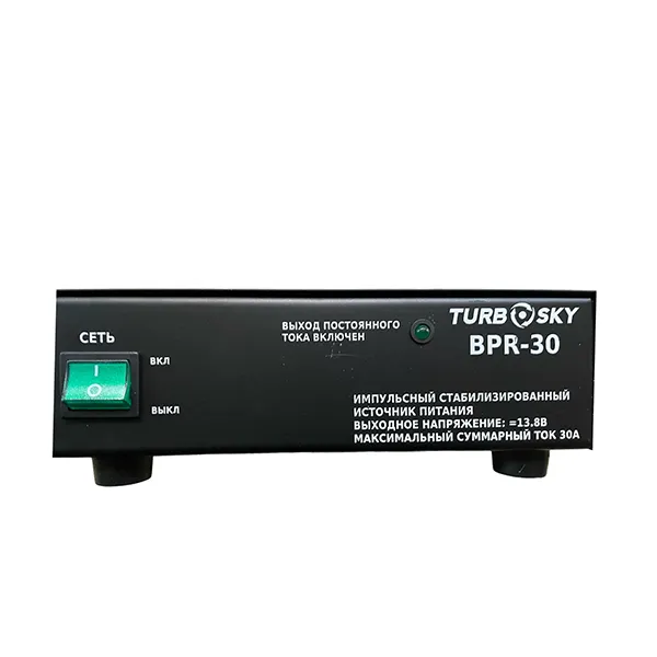 TurboSky BPR-30 — компактный стабилизированный блок питания, предназначенный для обеспечения постоянного напряжения 13,8 В ± 0,5 В постоянного тока с максимальным выходным током до 30 А. Устройство рассчитано на постоянную нагрузку 25 А и кратковременную — до 30 А, что делает его подходящим для питания мощного радиотехнического оборудования.