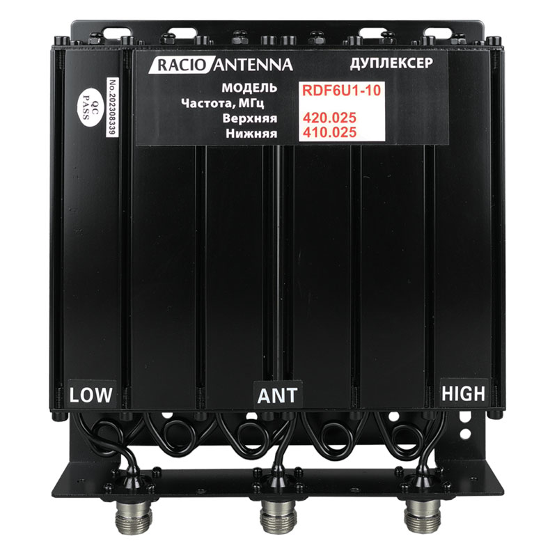 Дуплексер Racio Antenna RDF6U1-10 использует шесть спиральных резонаторов по режекторной схеме для частот 410.025-420.025 МГц. Частотный разнос 8-12 МГц обеспечивает одновременную работу TX/RX через одну антенну. Антенный порт N-female, входы передачи и приема – N-type.