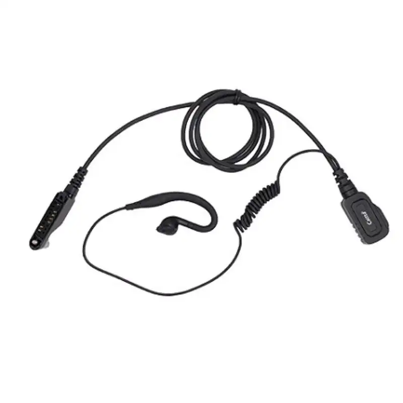 Гарнитура с наушником на отдельном проводе представляет собой удобное и функциональное устройство. Наушник с креплением-заушиной может быть надежно закреплен на правом или левом ухе в зависимости от предпочтений пользователя. Кнопка Push-To-Talk (PTT) и микрофон объединены в одном блоке, что обеспечивает удобство использования без необходимости крепления к одежде.