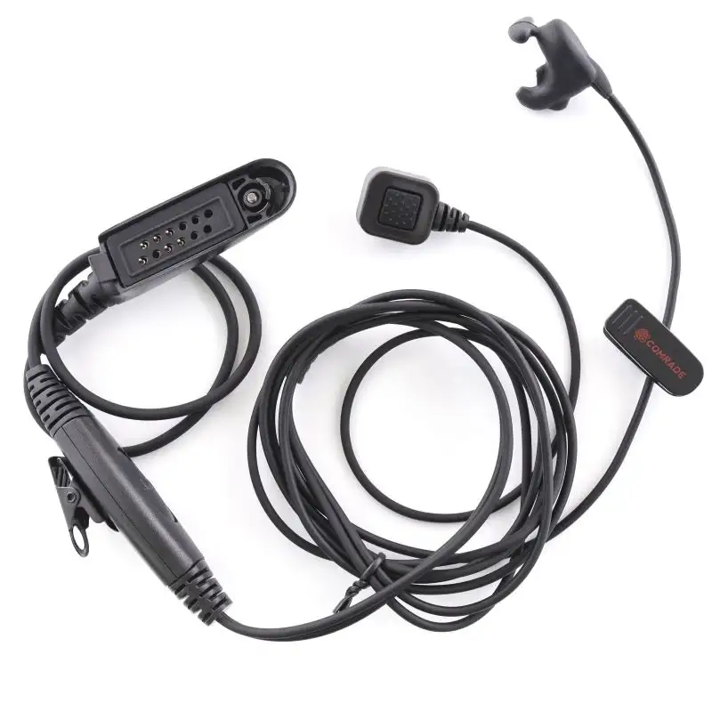 Устройство оснащено выносной кнопкой PTT, которую можно закрепить на пальце, что обеспечивает быстрый и удобный контроль передачи голоса без необходимости держать микрофон. Гарнитура имеет 13-контактный разъём, что гарантирует совместимость с популярными радиостанциями Motorola GP и Comrade R8.