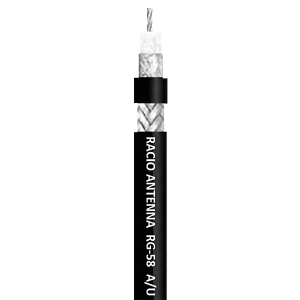 Racio Antenna RG-58 A/U в бухте 300 м использует многожильный центр из 19 жил луженой меди (ø0.94 мм) с вспененным полиэтиленом ø2.9 мм для затухания 41.4 дБ/300 м при 150 МГц и 75.6 дБ при 450 МГц. Двойное экранирование фольгой и оплеткой 97% луженой меди (16×7×0.12 мм ø3.6 мм) дает >90 дБ защиты от наводок.