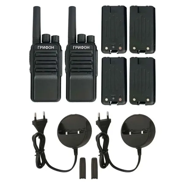 | Комплектация | Комплект портативных радиостанций ГРИФОН G-33 + Аккумуляторная батарея Li-Ion 1200мАч + Зарядное устройство от сети 220В + Поясная клипса + Инструкция на русском языке + Гарантия | |
