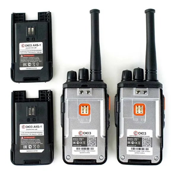 | Комплектация | Радиостанция Союз-1 - 2шт + Аккумулятор Li-Ion 1100 мАч - 2шт + Зарядное устройство с 2 usb портами + Антенна - 2шт + Клипса - 2шт + Ремешок на руку - 2шт + Автомобильное ЗУ с 2 usb портами + Инструкция по эксплуатации + Гарантийный талон | |