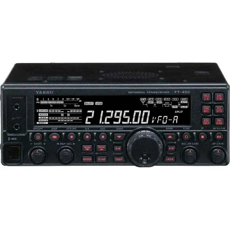 Yaesu FT-450 - это КВ-трансивер диапазона 0,03-56 МГц. Вот некоторые из его характеристик: передатчик мощностью до 100 Вт (до 25 Вт в AM модуляции), дисплей с подсветкой, кнопки с подсветкой и компактные размеры корпуса.