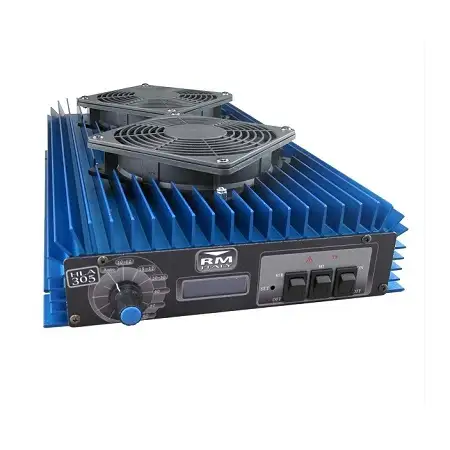 Усилитель мощности RM HLA 305/V HF — профессиональный линейный усилитель для радиолюбительских КВ диапазонов с частотным охватом 1.5-30 МГц, включая WARC диапазоны. Усилитель принимает входной сигнал мощностью от 1 до 15 Вт и способен выдавать до 300 Вт в режимах AM, FM и CW, а в SSB — до 550 Вт при входе 10 Вт.