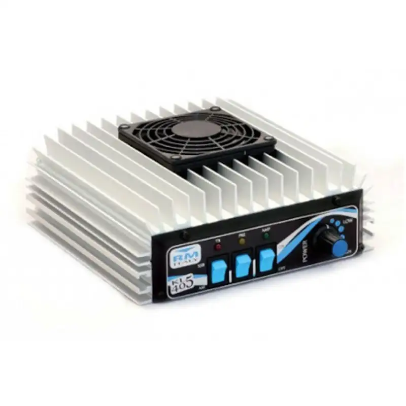 Усилитель RM KL 405V предназначен для усиления радиосигнала в HF диапазоне 3-30 МГц с выходной мощностью до 200 Вт в режимах AM/FM и до 400 Вт в режиме SSB при входной мощности 1-10 Вт. Питание осуществляется от источника 12-14 В с током потребления 14-22 А.