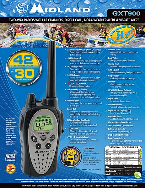 | Комплектация | Две радиостанции Midland GXT 900 + 2 клипсы для ношения на поясе + 2 Ni-MH аккумулятора 6В + Настольное зарядное устройство на 2 радиостанции + Сетевой адаптер + 2 гарнитуры + ЗУ от прикуривателя + Инструкция на русском языке + Гарантия | |