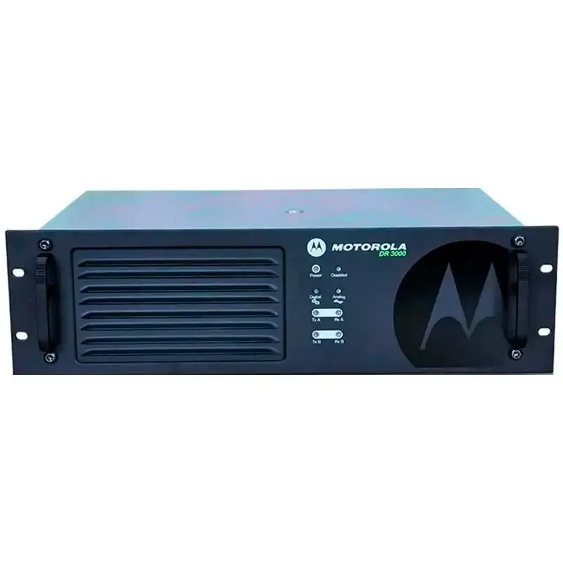 Профессиональный цифро-аналоговый ретранслятор Motorola DR3000 (UHF, 403-470 МГц). Мощность передачи — до 25 Вт в непрерывном режиме. Технология TDMA позволяет одновременно работать двум линиям связи на одной частоте, удваивая ёмкость системы. Устройство полностью автономно, оснащено двумя антеннами (RX/TX) и программируемыми клавишами для быстрого доступа к функциям. Индикатор на панели отображает статус работы и уровень мощности.