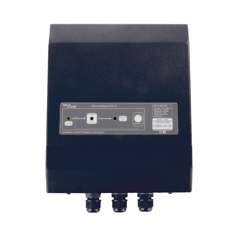 О состоянии прибора пользователь может узнать по светодиодной индикации. Блок питания Navcom Alfa-4 соответствует классу влагозащиты IP-44 и имеет сертификат Российского Речного Регистра. Питание осуществляется от сети постоянного тока с напряжением 12 В, 24 В.