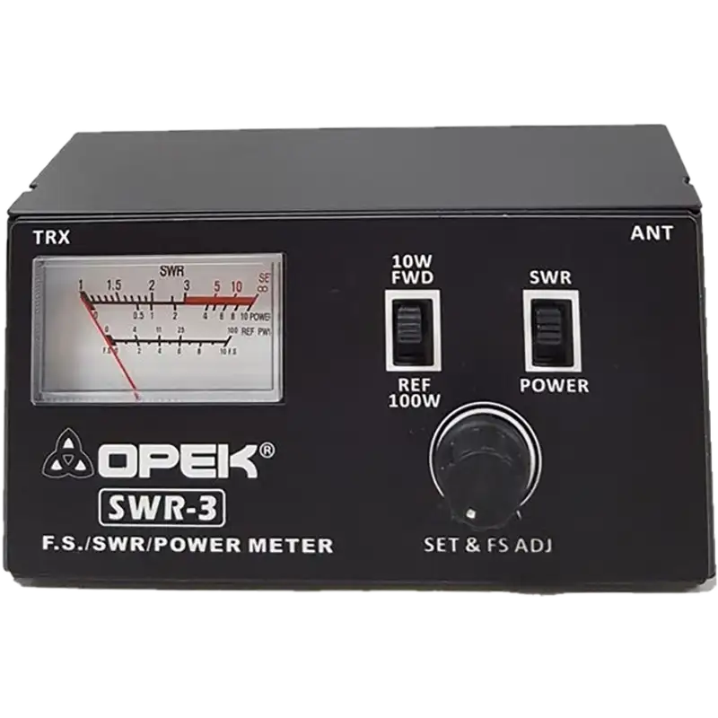 Прибор для измерения КСВ и мощности Opek SWR-3. Благодаря встроенной антенне может измерять напряжённость электромагнитного поля передатчиков, находящихся в непосредственной близости от прибора.