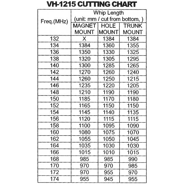 Антенна настраивается укорочением длины штыря по значениям таблицы подрезки, входящей в комплект.