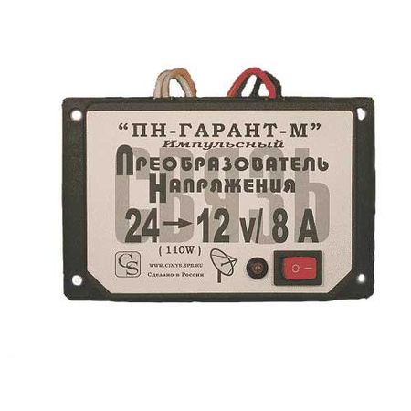 Импульсный преобразователь ПН-Гарант-М напряжения 24 В в 12 В. Используется для питания приборов с напряжением питания 12 В в автомобилях, поездах, автобусах и другом транспорте с напряжением бортовой сети 24 В. Номинальный выходной ток устройства - 8 Ампер.