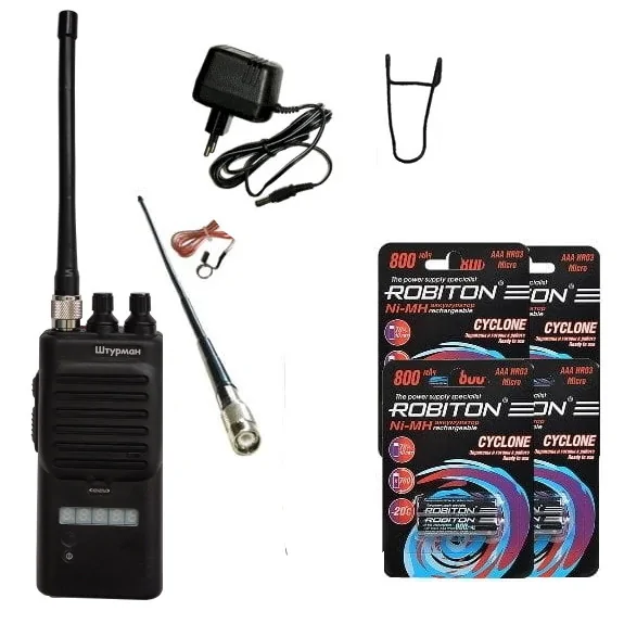 | Комплектация | Радиостанция Штурман-200_5 + Антенна 14 см + Антенна 33 см со съемным противовесом + Поясная клипса + Аккумуляторы Robiton Cyclone 800мАч (8 шт. ААА) + Зарядное устройство + Документация + Гарантия | |