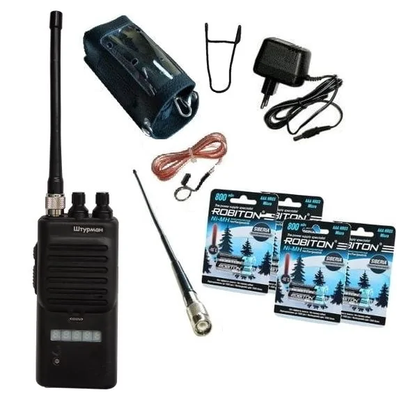| Комплектация | Радиостанция Штурман-200_8 + Антенна 14 см + Антенна 33 см со съемным противовесом + Поясная клипса + Аккумуляторы Robiton Siberia 800мАч (8 шт ААА) + Зарядное устройство + Кожаный чехол + Документация + Гарантия | |