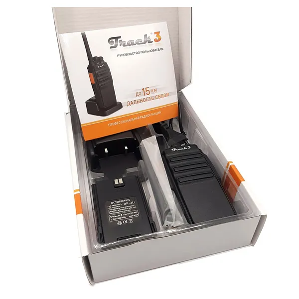 | Комплектация | Рация Track 3 + Аккумулятор Li-ion (1800 мАч) + Антенна портативная + Зарядное устройство + Клипса + Ремешок на руку + Руководство по эксплуатации + Гарантия | |