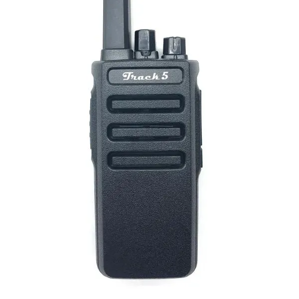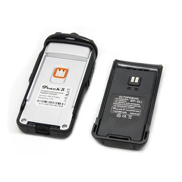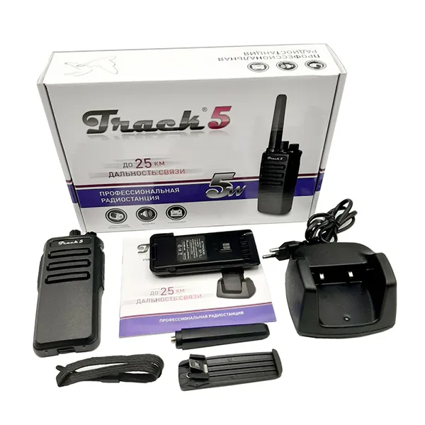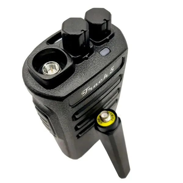 Модель Track-5 охватывает UHF 400-470 МГц с мощностью 5/1 Вт и 16 каналами, из которых 8 предустановлены на LPD и 8 на PMR частоты для быстрого развертывания без лицензии. Корпус на алюминиевом шасси размером 110x58x35 мм массой 275 г имеет защиту IP54 от пыли, влаги и грязи, функционируя стабильно от -10°C до +50°C. Аккумулятор Li-Ion 1800 мАч 7,4 В обеспечивает около 8 часов активной работы в стандартном цикле или дольше с энергосбережением.