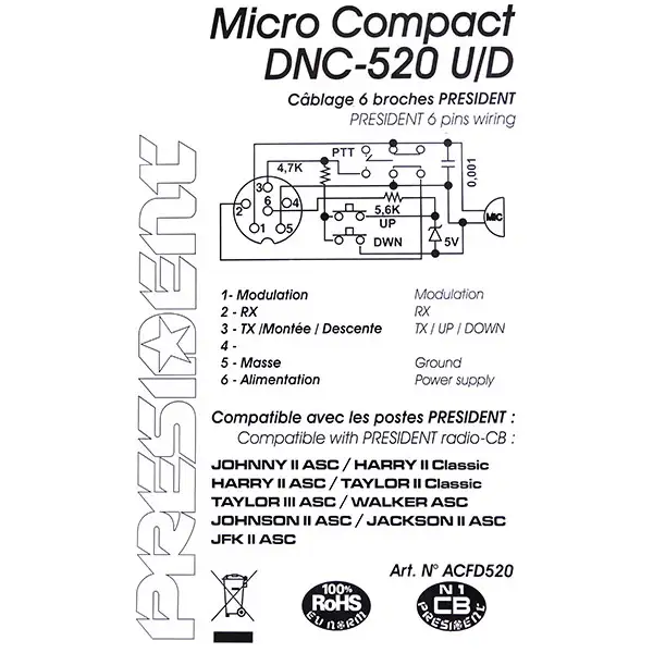 Оригинальная тангента President DNC-520 U/D / ACFD520 для мобильно-базовых радиостанций President, оснащённых 6-ти пиновым гарнитурным разъёмом. Снабжена клавишей PTT и кнопками переключения каналов - "Вверх" и "Вниз".