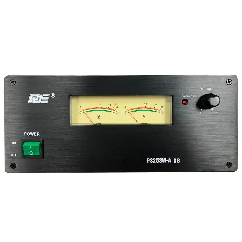 QJE PS25SW-A BB - это блок питания импульсного типа для преобразования 220 В переменного тока в 13,8 В постоянного тока. В список его характеристик входит: допустимая нагрузка до 25 А, пиковая до 27 А, стрелочный вольтметр, стрелочный амперметр, возможность подключать внешний аккумулятор, простая надёжная конструкция и иммунитет к короткому замыканию.