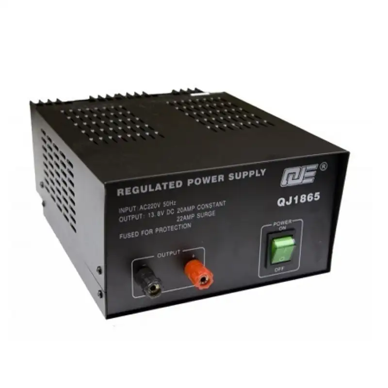 QJE QJ1865 - это блок питания трансформаторного типа для преобразования 220 В переменного тока в 13,8 В постоянного тока. В список его характеристик входит: допустимая нагрузка до 20 А, пиковая нагрузка 22 А, простая надёжная конструкция и иммунитет к короткому замыканию.