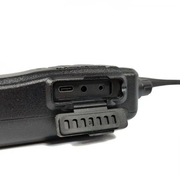 Разъём Type-C под резиновой заглушкой предназначен для зарядки и программирования с ПК, Kenwood-разъём — для тангет и гарнитур. Литиевый аккумулятор обеспечивает 48 часов автономии. Опции включают GPS с передачей координат в Alarm и APRS (цифровой/аналоговый), Bluetooth-модуль, Man Down. Запись DMR-разговоров — до 14 ч (опция до 500 ч) с прослушиванием на компьютере.