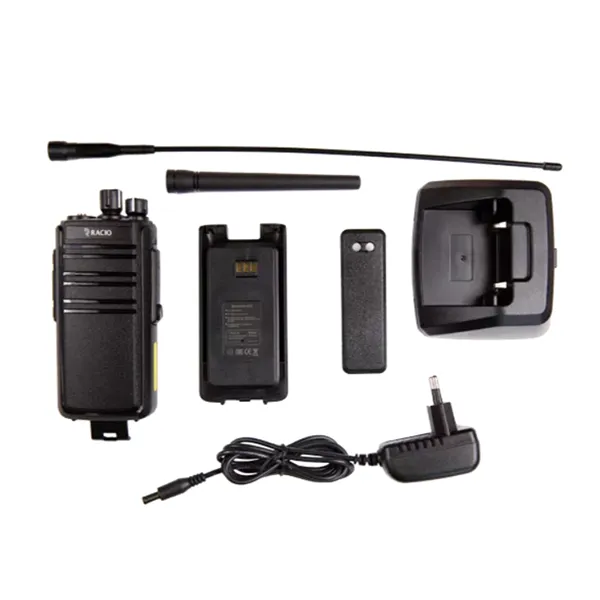 Портативная радиостанция Racio R800 VHF предназначена для полевых условий и работает в диапазоне 136-174 МГц с регулируемой выходной мощностью до 10 Вт. Корпус соответствует стандарту IP67, обеспечивая защиту от пыли и погружение в воду на глубину 1 м на 30 минут. Модель имеет 16 каналов памяти, выбор ширины канала 12,5/25 кГц, сканирование, запрет передачи на занятом канале.