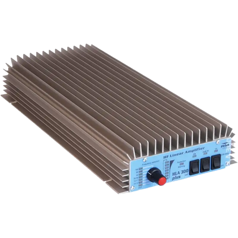 Усилитель мощности RM HLA 300 Plus — линейный усилитель с микропроцессорным управлением, предназначенный для использования в КВ диапазоне от 1.8 до 30 МГц. При входной мощности 1-15 Вт (до 30 Вт для SSB) он способен выдавать мощность 300 Вт в режимах AM, FM и CW, а также до 550 Вт PEP в режиме SSB.