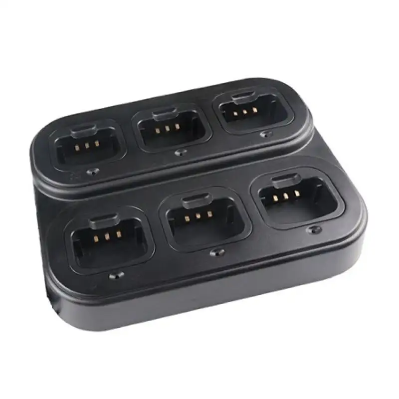 Многопозиционная зарядная консоль Racio RC806 параллельно восстанавливает аккумуляторы R800/R810 IP67 из сети 110-220 В, выдавая 8.7 В / 500 мА с микропроцессорной логикой для оптимального профиля Li-Ion. Шестиканальность ускоряет циклы 5-6 часов, идеально для сменных постов с большим парком станций.