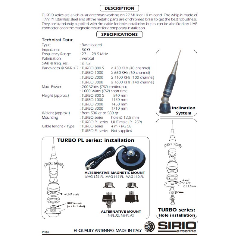 Антенна Sirio Turbo 3000 PL Blue Line предназначена для CB диапазона 27-28.5 МГц и обеспечивает высокую мощность передачи — 200 Вт в постоянном режиме и 1000 Вт кратковременно. Штырь изготовлен из прочной хромированной стали 17/7 PH, что обеспечивает долговечность и стойкость к коррозии.