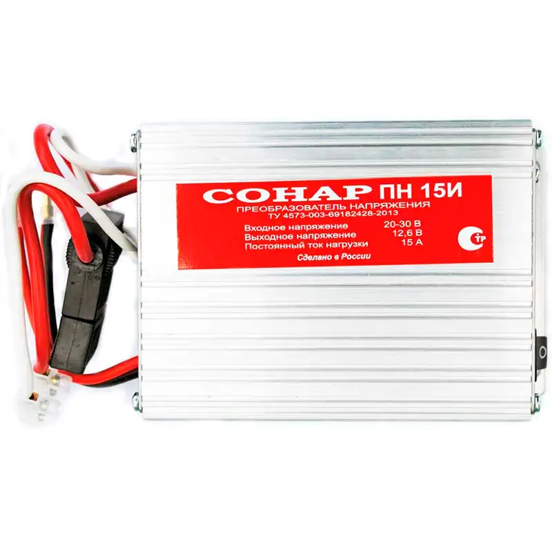 Сонар ПН-15И - это импульсный преобразователь напряжения 24-12 В. Вот его характеристики: входное напряжение 20-30В, выходное напряжение 13,8 В и постоянный ток нагрузки до 15 А.