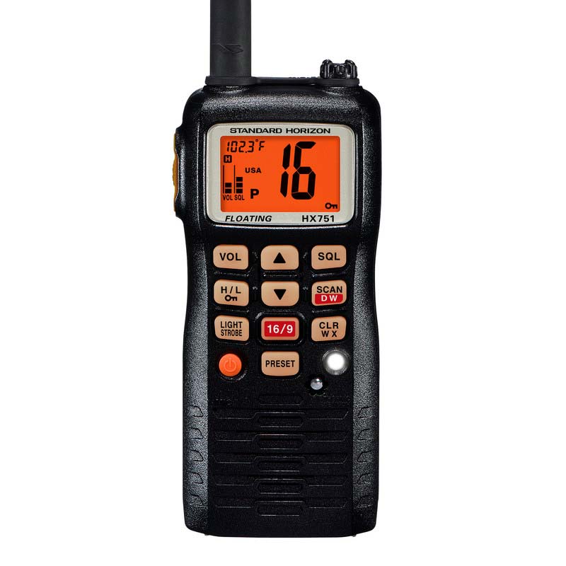 Standard Horizon HX-751S - это влагозащищенная и плавающая портативная рация морского диапазона частот для двусторонней связи. Имеются американские, международные и канадские каналы морские каналы.