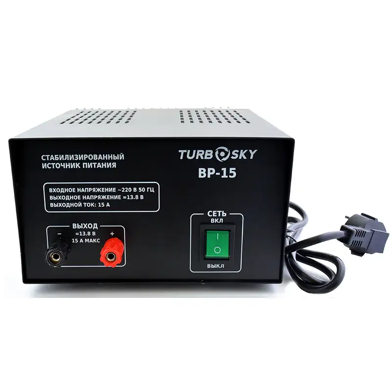 TurboSky BP-15 - это блок питания трансформаторного типа для преобразования 220 В переменного тока в 13,8 В постоянного тока. В список его характеристик входит: допустимая нагрузка до 15 А, простая надёжная конструкция и иммунитет к короткому замыканию.