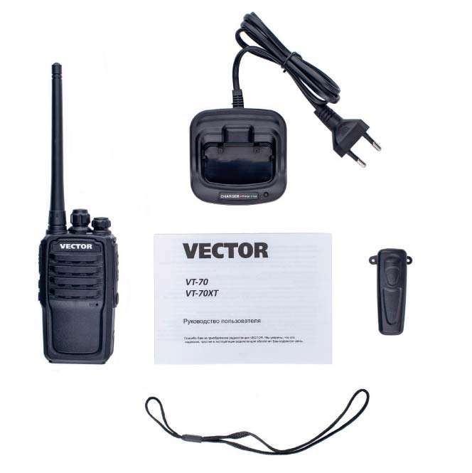| Комплектация | Портативная радиостанция Vector VT-70 + Аккумулятор Li-Ion 1500 мАч + Зарядное устройство + Антенна + Клипса для ремня + Руководство пользователя + Гарантия | |